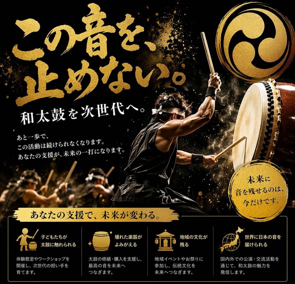「私たち岩倉太鼓友の会は次世代に和太鼓の素晴らしいさを継承していく為に日々活動しております。当会の活動にご賛同いただける方の賛助会員の入会、寄附金を広くお願いしております。一人でも多くの皆さまからご支援・ご協力をよろしくお願い申し上げます。」